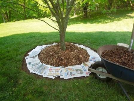 The paper will kill the grass while it decomposes--saving me hours of digging. By covering, rather than pulling up, the inner sod, I avoid disturbing many small roots. The grass will be gone and the paper barely recognizable by next year. The mulch will protect the tree from mowers and weed-wacker; help keep the soil moist; keep weeds at bay; and look more proportionality appropriate under the larger trees.